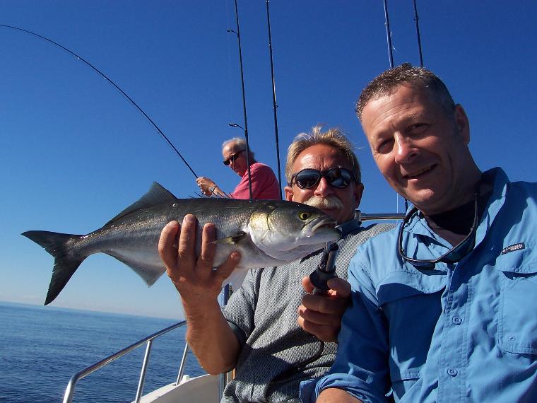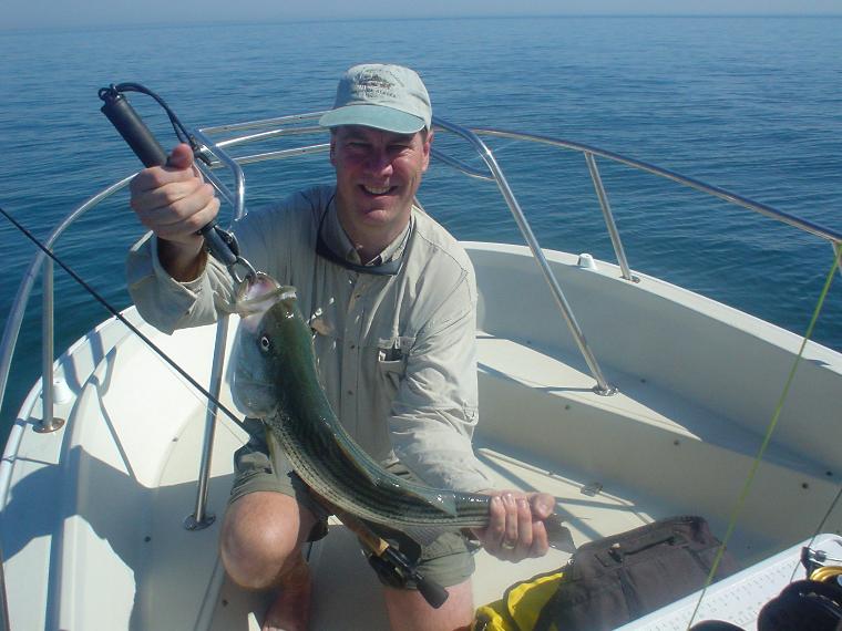 Peter Rowney of the UK First Bluefish on a fly Not overly large but the first of many |